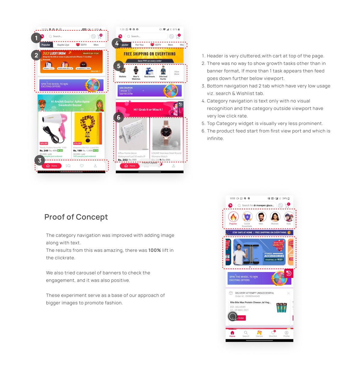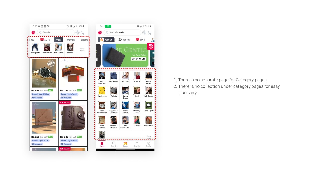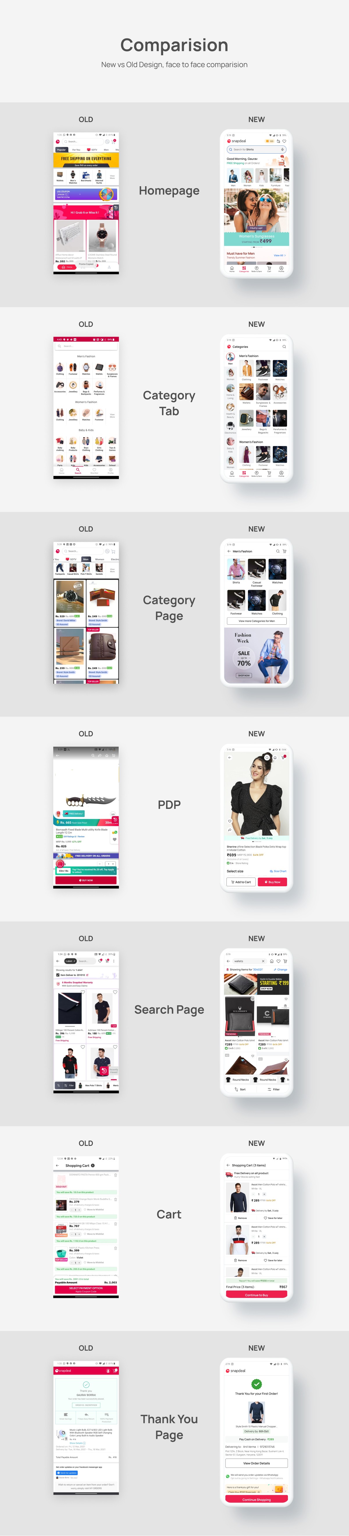 While Snapdeal had a massive customer base, feedback during user sessions highlighted key concerns: the app felt outdated, inconsistent, and not fashion-forward. There was a gap between the value-driven brand identity and how users experienced the app. Users struggled with friction in product discovery, inconsistencies in interface components, and an overall lack of visual hierarchy.