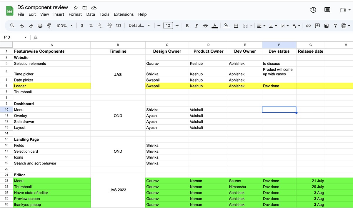 In order to track and communicate the progress of the different steps, we created a spreadsheet that can be viewed and updated both by design and development. We create Debt list for all components that link out to all the relevant documentation and move them to corresponding status columns (In Design, Needs Feedback, In Development, etc.) throughout the process.