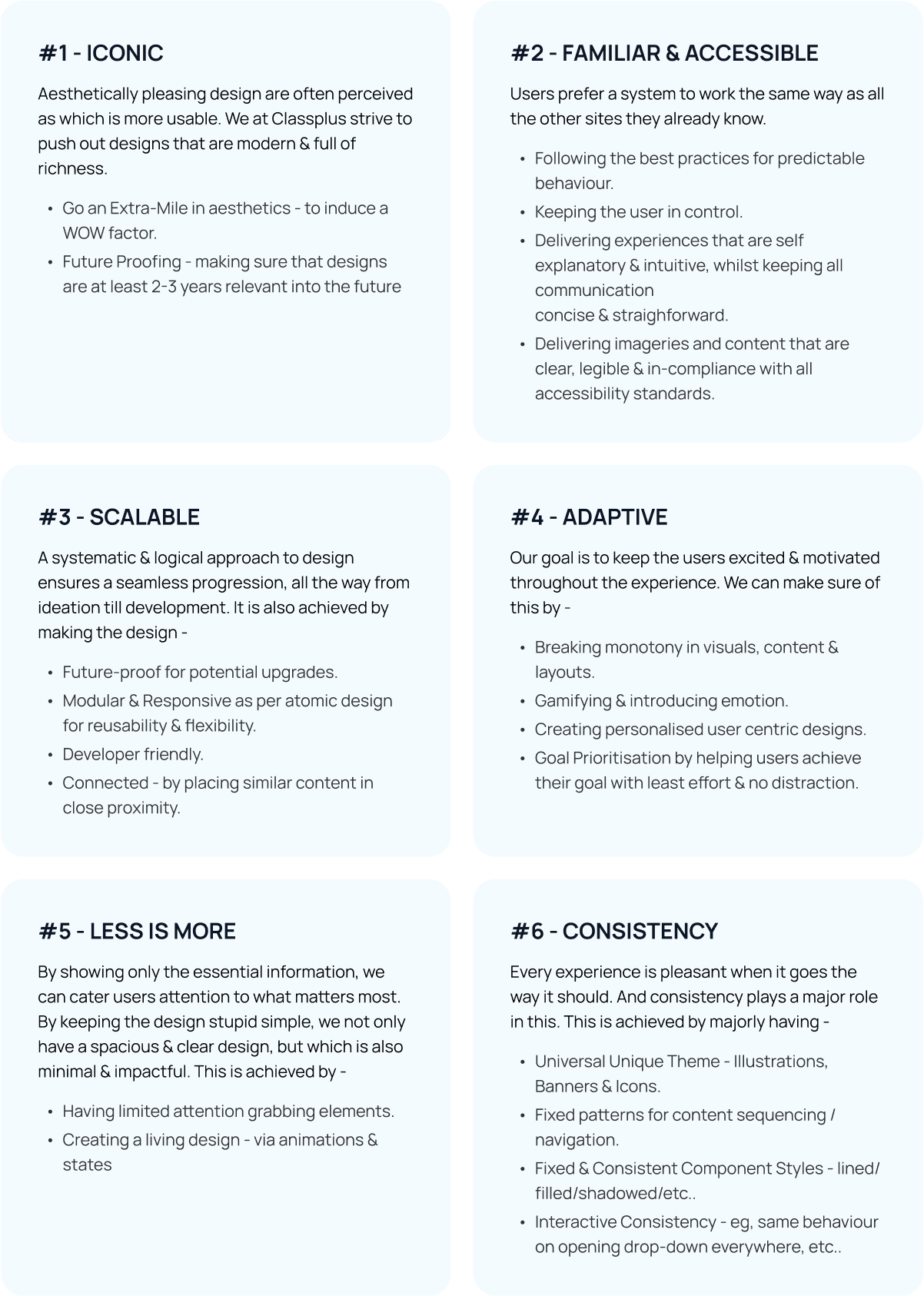 Following principles will act as a foundation for the Design System & as a guidance light whenever you have multiple ideas and need a decision factor. All 6 principles are crafted from existing design considering various factors - making this practical, realistic & effective.
